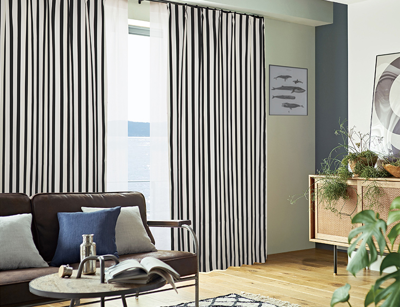 爽やかな「ストライプ」と「昼夜目隠しUVカットミラーレース」のセットがおすすめ。