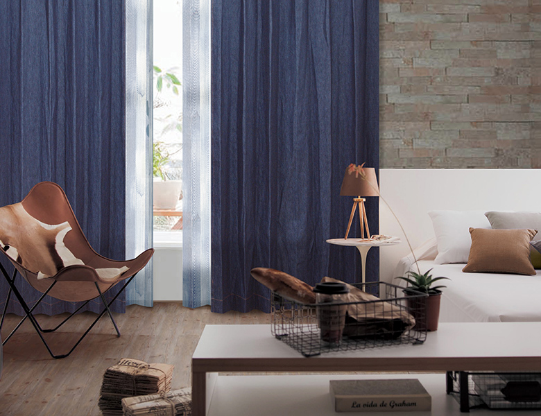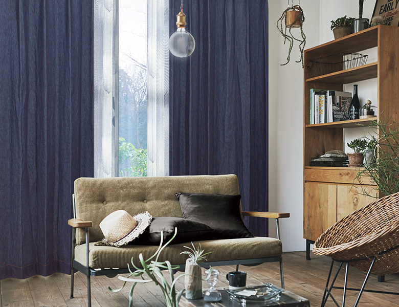 本物のデニム生地を使用した「デニマニア」と、天然ライクな質感の「インディゴストライプ レースカーテン」のセットがおすすめ。