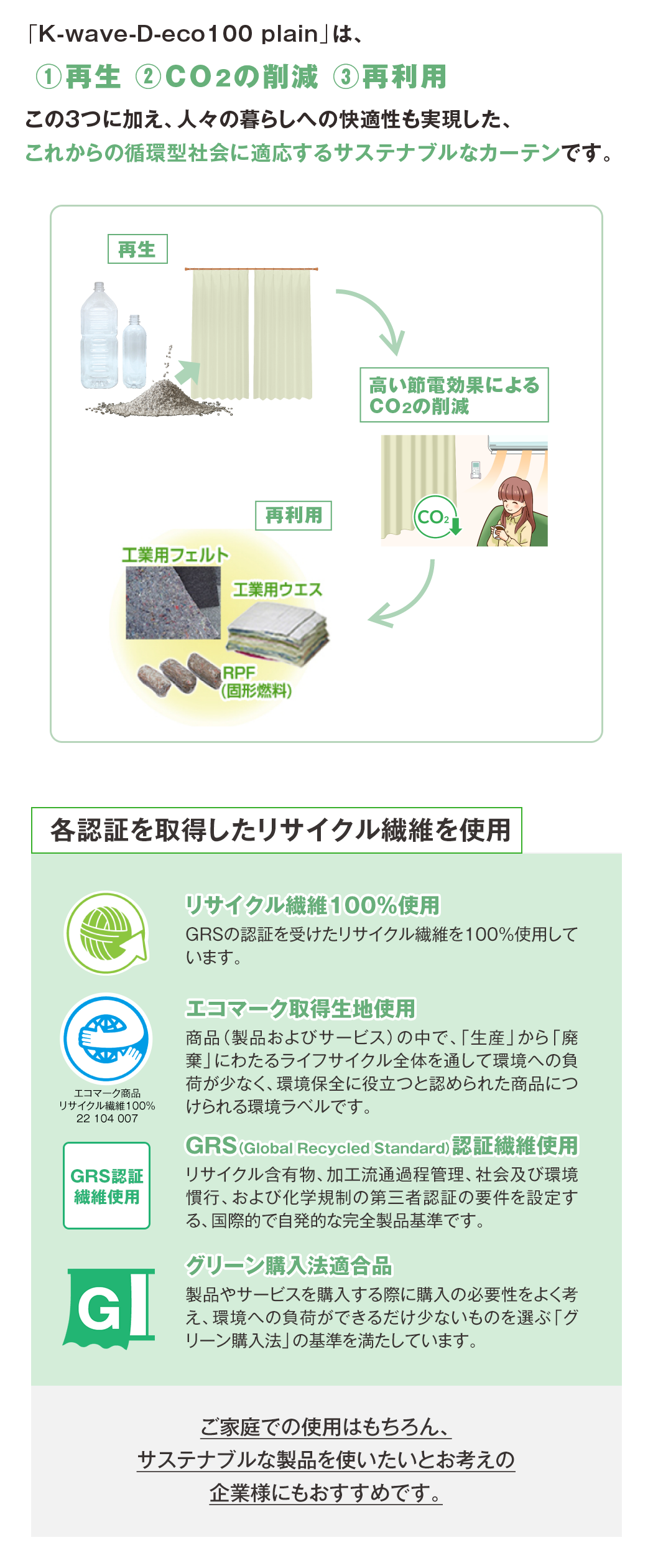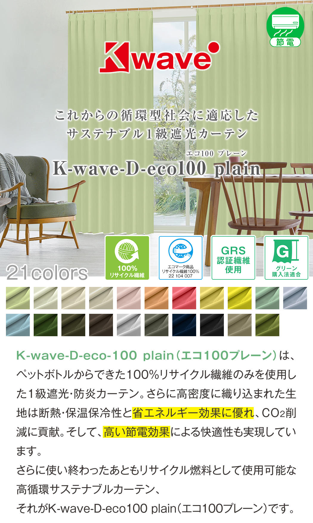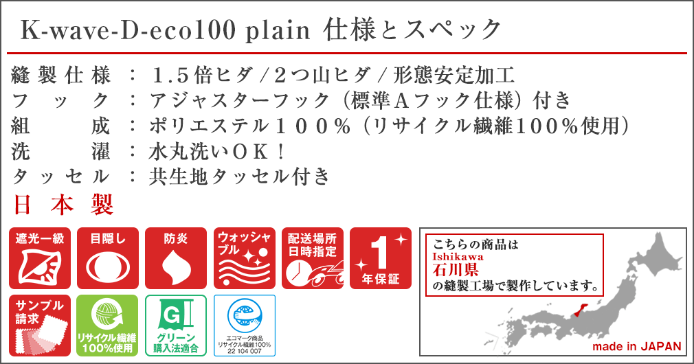 循環型社会に適応したサステナブル1級遮光カーテン「K-wave」は、株式会社くれないの登録商標です。(登録番号第6235969号)K-wave® 共通ディティール※イメージはK-wave-D-shineを使用しています。今、この商品を注文すると?