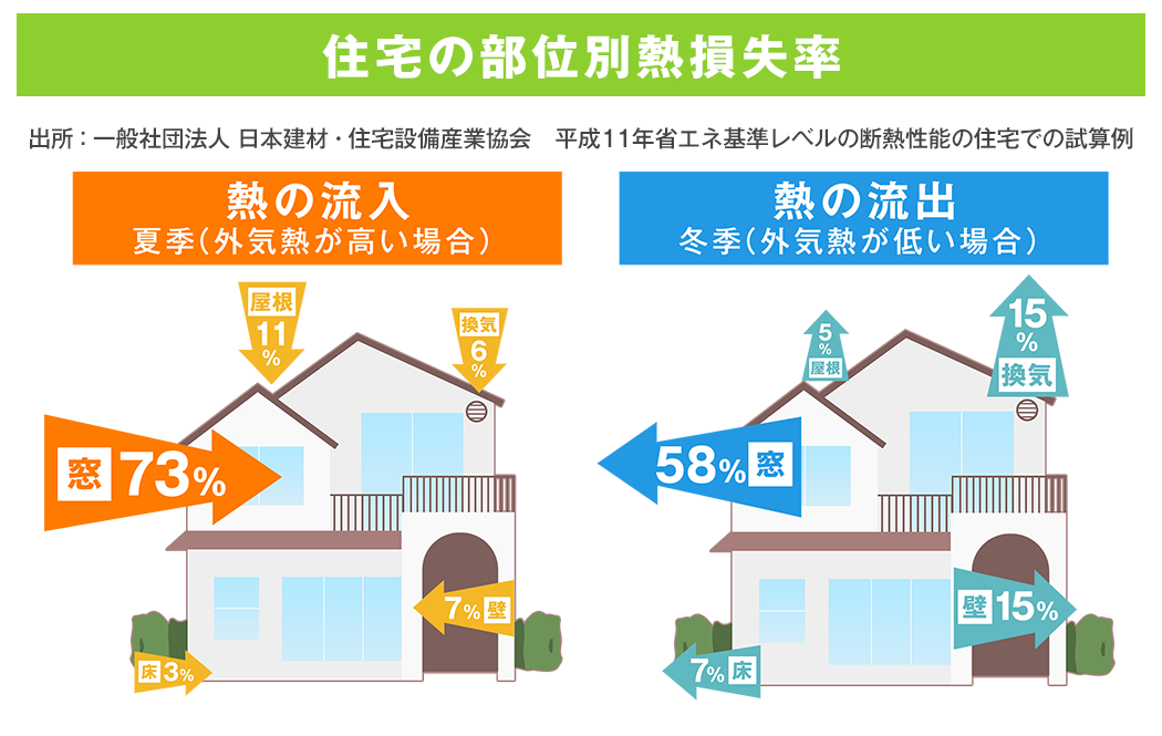 保温効果・保冷効果を高めるには、冷暖房をつけているお部屋の空気を外に逃がさず、 夏であれば太陽熱や暖かい外気を中に入れない、冬であれば冷たい外気をお部屋に入れない事が冷暖房の効きを高め省エネにつながります。