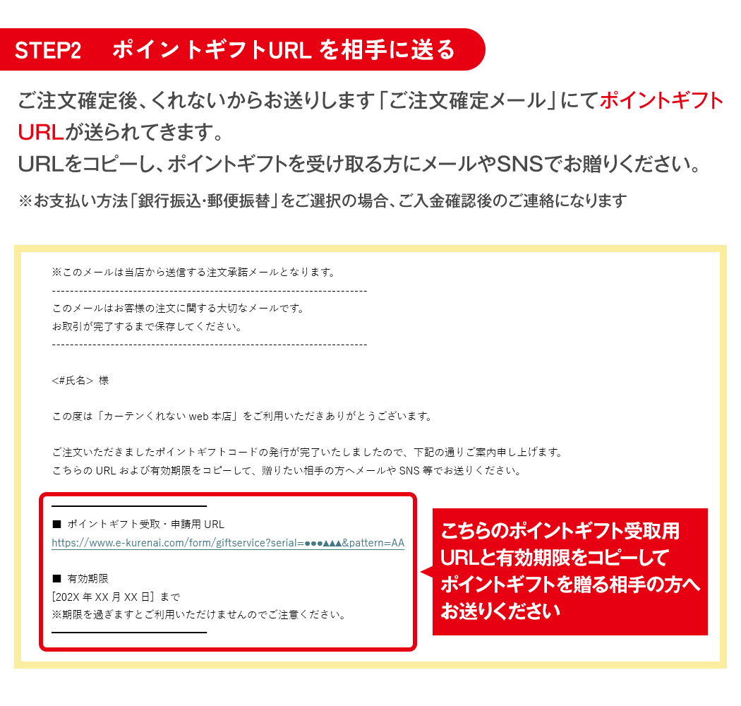 ご注文確定後(銀行振込・郵便振替をご選択の場合はご入金確定後)営業時間内でしたら当日、営業時間外でしたら翌営業日(土・日・祝日・夏季冬季休暇を除く)に「ポイントギフトURL」をくれないからお送りします。