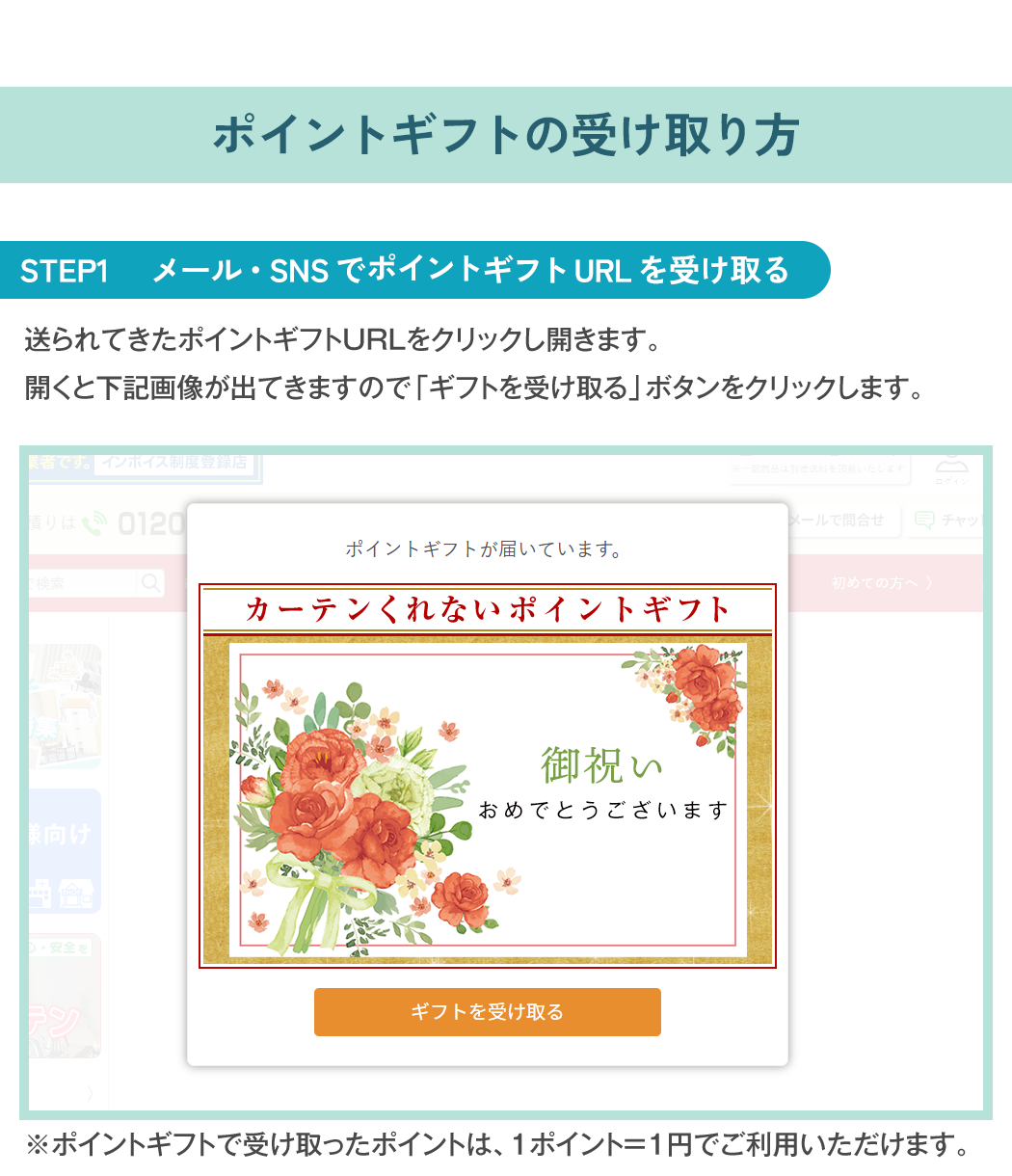 ポイントギフトをご購入されますと、ポイント受け取りURLをお送りいたします。